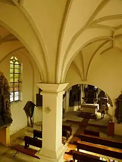 Všechny tři základní části kostela tj. presbytář, loď a věž, pocházejí z let 1573–1574. Loď i presbytář jsou zpevněny jednoduchými opěrnými pilíři. Do presbytáře vedou dvě hrotitá okna (původně byla tři, ale severovýchodní okno bylo zazděno při stavbě sakristie). Chór má hvězdovou žebrovou klenbu. Přechod z chóru do lodi tvoří jednoduchý polokruhový vítězný oblouk. Na jižní straně presbytáře se nachází panská oratoř, přístupná venkovním schodištěm. Panská oratoř je sklenuta českou plackou se štukovou ornamentální výzdobou. Loď kostela má čtyři okna s jednoduchou gotizující plaménkovou kružbou, stejného typu jako v presbytáři. Protože zdi jsou poměrně tenké, jejich stabilitu pomáhají řešit jednoduché opěrné pilíře. Vnitřní prostor je sklenut čtyřmi poli hvězdové křížové klenby na středový sloup, čímž vzniká tzv. halové dvojlodí. Stěny jsou odlehčeny slepými arkádami. Presbytář i loď mají valbovou střechu. Vysoká hranolová věž se vstupem na západní straně je zastřešena jehlancovou střechou.