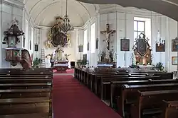 Interiér charakterizuje dojem monumentální prostoty vytvořený působením hladkého, téměř nezdobeného zdiva. Dominuje mu kupole zdvihající se nad hlavní lodí, zakončená lucernou, jejímiž okny proniká do středu kostela intenzivní světlo. Hlavní oltář pochází z roku 1770. Obraz Setkání knížete Václava s Radslavem Zlickým vznikl v okruhu malíře Karla Škréty.[9]