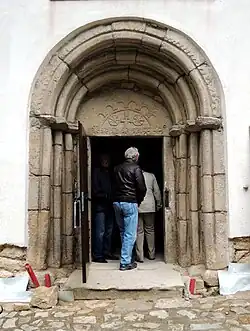 Na jižní straně lodi je situován žulový pozdně románský ústupkový portál s tympanonem. V ostění i záklenku probíhají tři ústupky s výraznými oblouky na hranách. V patě záklenku probíhá výrazná jednoduše profilovaná římsa. Záklenek je na vnější straně lemován jemnou klikatkou. V mělkém reliéfu tympanonu je v centru umístěn kříž, doplněný dvěma slunci. Plocha tympanonu je lemována mělce vyznačeným obloučkovým vlysem, spodní hrana řadou drobných hvězdic. Západní portál pochází z barokní výstavby, stejně jako půlkruhem zaklenutá okna lodi i presbyteria. Západní střešní štít je tabulový s projmutými postranními křídly a trojúhelným tympanonem ve vrcholu. Korunní římsa lodi i presbyteria je barokní, s omítkovým profilem.