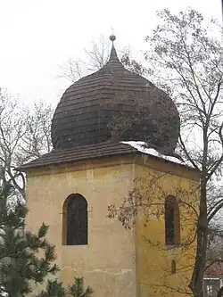 Jižně od kostela stojí před hlavním vchodem samostatná zděná hranolová nízká věž s hladkými fasádami, která byla postavena při přestavbě kostela v roce 1735. Má polokruhová okna a cibuli, která je kryta šindelem.[2] V srpnu 1968 byla poškozena, když do ní najel ruský tank patřící k invazním vojskům Varšavské smlouvy, ale nezřítila se. Je na ní zavěšen zvon z roku 1929 od Richarda Herolda. V minulosti zde byl zvon z roku 1602 od Görga Bienera a ještě nejméně jeden další zvon.[7]