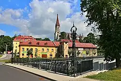 Vedle kostela stojí barokní fara z roku 1739. Okolo kostela je zeď bývalého hřbitova, který odděluje faru s kostelem. V této zdi je umístěn soubor 15 náhrobních desek, které patří významným rodákům a místním šlechticům. Většinou se jedná o figurální díla z období let 1586 až 1829. Náhrobek Fr. Kheila z roku 1829 je ozdobený sochou Krista od J. Maxe. Umělecky hodnotně zvládnutý je zvláště dvojitý náhrobek manželů Mutzelových (č. 12) pocházející z roku 1652.