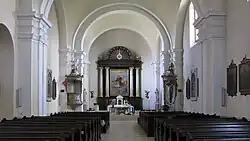 Zařízení kostela zahrnuje hlavní oltář s klasicistním retábulem s obrazem svatého Vavřince z roku 1841. Doplňují jej tři vedlejší mramorové retabulární oltáře ze 20. let 20. století. Kazatelna a křtitelnice pochází z roku 1788.[4]