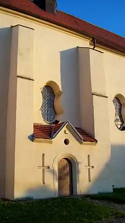 Jedná se o jednolodní, obdélnou stavbu s obdélným širším presbytářem s opěráky. Vně má kostel kasulová okna. Na západní straně je vysoké obdélné okno a dvě oválná okna.[6]