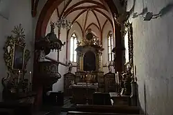 Kněžiště je od lodi oddělené pomocí hrotitého lomeného vítězného oblouku. Nad obloukem je umístěn znak a nápis: „Nákladem záduše obnoveno 1881.“