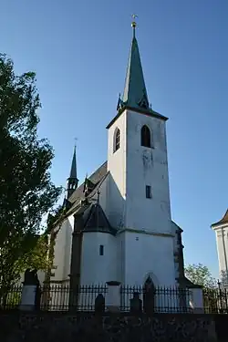 Kostel se skládá z předsíně, jedné lodi, západní věže, kněžiště a sakristie. Kněžiště je tvořeno jedním obdélným polem a pětibokým závěrem. Presbytář kostela je tradičně orientovaný na východ. Ze severní strany k němu přiléhá sakristie na čtvercovém půdorysu. Na obdélnou loď o dvou polích navazuje věž a osmiboká věžička s točitým schodištěm. Střešní krytina kostela i věže je břidlicová, není původní.[3] Ke kostelu náleží renesanční zvonice a hřbitov.