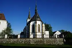 Kostel je bíle omítnut, s výjimkou prvků z opracovaného lomového kamene, jako jsou čela opěrných pilířů, okna a portály. Západní průčelí je tvořeno hranolovou věží a schodištěm.