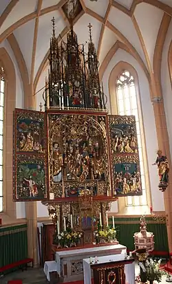 Vybavení interiéru, které se v kostele nachází je velmi zdobné a časově různorodé. Nejhonosnějším předmětem je bezesporu pozdně gotický, jedenáct metrů vysoký, hlavní oltář, který je umístěn v presbytáři. Oltář je z dílny takzvané Bolzánské školy a dokončen byl v roce 1520. V presbytáři se dále nacházejí novogotické oltáře, které byly přidány v roce 1909.