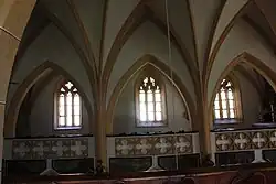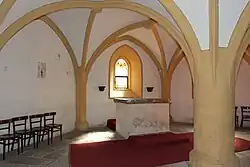 Pohled na boční oltář a svazčité přípory umístěné v presbytáři -