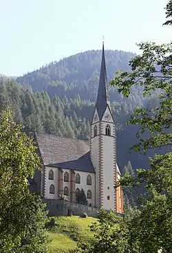 Okna jsou nezasklena a jsou dvojitě dělena pomocí jednoho svislého prutu, který je centricky umístěn v okenním otvoru a v horní části okna končí v kýlových obloucích. Okna jsou opatřena kružbou ve tvaru čtyřlaloku. Kostelní věž zastřešuje velmi vysoká a strmá střecha ve tvaru osmistranného jehlanu, což je typickým znakem kostelů v alpských oblastech. Střecha je opět pokryta střešní krytinou ze štípaných dřevěných šindelů.