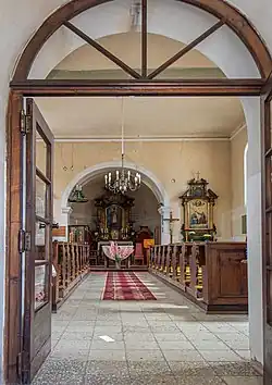 - Chórová přepážka je raně barokní řezbářská práce, pravděpodobně také z 80. let 17. století. Dřevo, mladší polychromie imitující mramor; výška 73 cm, výška jednotlivých kuželek 65 cm. Jednoduchá dřevěná balustrová přepážka je osazena v rovině triumfálního oblouku. Chybí střední část přepážky – dvoukřídlá dvířka.