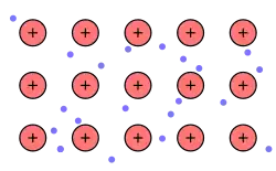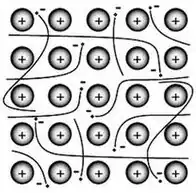 Ilustrace kovové vazby - volné elektrony se pohybují mezi kladně nabitými ionty