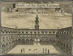 Gershamova původní budova byla zničena Velkým požárem Londýna roku 1666. Burza byla obnovena podle návrhu Edwarda Jarmana a otevřena roku 1669. I tato stavba byla zničena v lednu roku 1838 požárem.