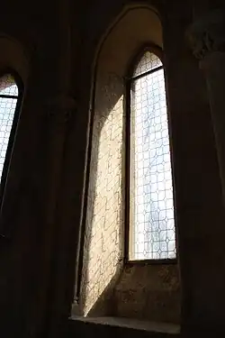 V síle severní zdi se za portálkem nachází schodiště, po kterém vystoupáme do horního patra kaple. To je díky pěti vysokým oknům v presbytáři mnohem světlejší než spodní. Výraz horního prostoru je lehčí, ozdobnější a vznešenější než spodní. Kontrast mezi spodním a horním patrem nebyl neobvyklý, je naopak příznačný pro všechny patrové kaple. V jižní zdi se našly pozůstatky ostění dvou oken, která byla ovšem zazděna. Dnes odkrytá slepá okna svým stylem odpovídají oknům v presbytáři. Ta jsou prostá a poměrně veliká. Jsou vyplněná tabulkovým sklem a nejsou v nich osazeny kružby. Zajímavým architektonickým prvkem je ostění, které ve formě válcového prutu obíhá bez přerušení celé okno a je na každé straně posazené na miniaturním soklíku. Ostění tedy zvýrazňuje okenní otvor.