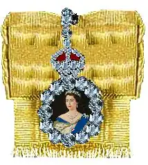 Řádový odznak má podobu medailonu s barevným portrétem mladé královny Alžběty II. oblečené ve večerních šatech se stuhou a hvězdou Podvazkového řádu. Miniatura původně namalovaná na slonovině, od roku 2017 na skle, je lemována diamanty. Medailon je převýšen tudorovskou korunou. Na zadní straně je v medailonu královský monogram a koruna svatého Eduarda.[3][4]
