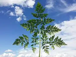 Lodyha bývá nejčastěji vysoká 80 až 180 cm, je pevná, mělce rýhovaná, oblá, dutá, pod uzlinami je ztluštělá a vyrůstá z hlízovitě zhrublého až řepovitého kořene. Přímá lodyha je na nejdolejším článku porostlá tuhými, bílými, přitisklými chlupy které směrem nahoru olysávají, ve spodní části je lodyha červenavě skvrnitá a v horní zelená a bohatě větvená do květenství. Je porostlá pochvatými, svěže zelenými, složenými listy s krátkým řapíkem, které mají čepel, v obryse široce vejčitou až široce trojúhelníkovitou, dvakrát až třikrát zpeřenou. Čepel je tvořená až deseti jařmy lístků složených z lístečků ještě dále zpeřených, lístečky posledního řádu jsou úzce kopinaté, celokrajné a s jemnou bělavou špičkou.