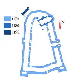 Mezi vnitřními a vnějšími branami bylo nádvoří, vedoucí k vnitřním budovám, vystavěnými v gotickém slohu, jako je shromažďovací hala, kaple, sto dvacet metrů dlouhé skladištní prostory a dvě klenuté kamenné stáje, schopné pojmout až tisíc koní. Další skladiště byla vyhloubena ve skále pod hradem. Odhaduje se, že johanité by byli schopni odolávat obléhání až 5 let.