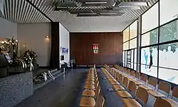 V 60. letech byla doplněna výzdoba interiéru obřadní síně o nástěnnou malbu "Život a smrt". V roce 1986 byla osazena leptaná kompozice truchlících pozůstalých na dvoudílné skleněné stěně, která je posuvná a při jejím otevření se překrytím motivů dociluje nového výtvarného efektu.