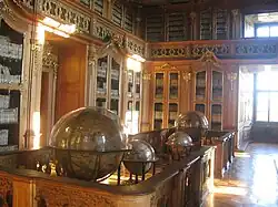 Skříně nejsou zaskleny z důvodu měnící se teploty v různých ročních obdobích. Řazení knih ve Velkém sále a Předsálí je podle tzv. piaristického třídění – od teologických témat ke světským. Nad skříněmi je umístěno latinské označení témat. Uprostřed Velké sálu knihovny se nachází 4 glóby zakoupené zakladatelem knihovny. Malířskou výzdobu stropu zámecké knihovny provedl v roce 1759 Josef Stern na zakázku biskup Leopolda hraběte z Egkhu (1578 – 1760). Na fresce Velkého sálu je zachycena Apoteóza biskupů Liechensteina – Castelkorna a Egkha. Celá freska je oslavou vzdělání a moudrosti, včetně upozornění na použití znalostí k dobru, jinak hrozí zavržení. Knihovna obsahuje přibližně 25 000 svazků.