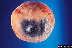 Šíření nákazy v rámci napadeného plodu je zajištěno především pomocí různých druhů esteráz. Jedním z nich je například kutináza, která je ve větší míře produkovaná. Tyto esterázy rozrušují původně celistvou buněčnou stěnu rostlinné buňky a tak umožňují houbě pronikat plodem a napadat ho i v dalších místech. Šíření mezi sousedními plody je zajištěno pomocí vnějších faktorů jako je vítr, činnost hmyzu, pohyb zvěře, lidí a dalších.[8][10]