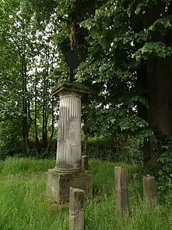 Do země je zapuštěn nízký podkladový díl. Na něj je osazen sokl ve tvaru kvádru, na nějž následně navazuje dřík v podobě kanelovaného sloupu. Při jeho severní straně je patrný medailon, jehož obsah již kdosi zcizil. Na vrcholu sloupu v místech těsně pod římsou se nachází pás tvořený akantovými listy a vejcovcem. Rohové části spodní strany plochého nástavce pro kříž jsou zaplněny ornamenty s floristickou tematikou. Na vlastní římse se nacházejí čtyři akroterie mající například reliéf měsíce a slunce, dále rozety a čtyři výstupky nesoucí plastiku Božího oka doplněný rostlinným dekorem.[2]