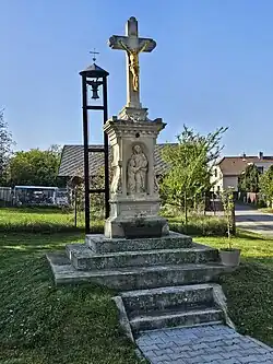 Pískovcový pilíř s krucifixem se nalézá na návsi na vyvýšeném místě. Na třech pískovcových schodech stojí nízký, hranolový podstavec ozdobený nahoře profilováním. Na tomto podstavci je umístěn další nízký sokl zakončený nahoře římsou. Na čelní straně tohoto soklu je umístěn rámeček s textem: „Kristus trpěl za nás, vám pozůstaviv příklad, abyste následovali šlépějí jeho. Petr 2,21“.