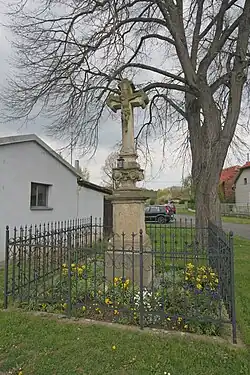 Krucifix je oplocen kovovou mříží. Čtvercový sokl je výškově 3x odstupňován a jeho nejvyšší část má na čelní straně ve vypuklém rámci s vykrojenými rohy umístěn rytý nápis "Postaven 1781, Obnoven 1893" a je zakončena profilovanou římsou.
