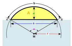 {\displaystyle s=2\,\tan {\biggl (}{\frac {\alpha }{2}}{\biggr )}\cdot {\biggl (}{\frac {b}{\mathrm {arc} \ \alpha }}-h{\biggr )}}