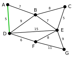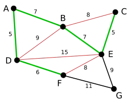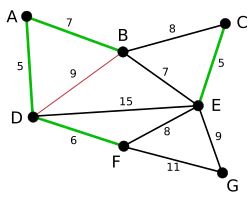 Následující nejkratší hranou jsou AB a BE s délkou 7. Vybereme hranu AB. Hranu BD označíme červeně, protože mezi B a D již existuje cesta označená zelenou barvou, přidání hrany BD do výběru by způsobilo vznik nežádoucí kružnice ABD. |