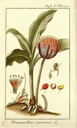 - ↑ a b BJÖRNSTAD, Inger N.; FRIIS, Ib. Studies on the genus Haemanthus L. (Amaryllidaceae). I. The ingrageneric taxonomy.. Norwegian Journal of Botany. 1972, čís. 19. Dostupné online.