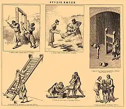 Některé druhy mučení. Při procesech s údajnými čarodějnicemi se používaly tři stupně: 1. palečnice, 2. španělská bota, 3. skřipec (vytažení na provaze) nebo žebřík