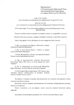 Dne 6. března 2014 přijala Nejvyšší rada Autonomní republiky Krym rozhodnutí o připojení Krymu k Rusku, které podle slov nového vicepremiéra Rustama Těmirgalijeva mělo okamžitou platnost. Ukrajinské ozbrojené síly, jež měly do té doby na Krymu své základny, Krym prý „okupovaly“. Dostaly na vybranou buď přijmout ruské občanství a připojit se k ruským vojskům nebo z poloostrova odejít. Několikatisícový dav proruských aktivistů shromážděný před simferopolským parlamentem přijal tuto zprávu s projevy radosti.[60] Datum konání referenda, na němž se mělo kromě zvýšení autonomie Krymu v rámci Ukrajiny rozhodnout i o jeho připojení k Rusku, bylo posunuto na 16. března 2014.[60]