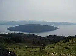 Na jezeře se nachází velký zalesněný ostrov Nakadžima (中島), který je centrálním konusem kaldery.