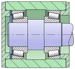 Uspořádání kuželíkových ložisek do X, předpětí vyvozeno podložkami pod levým ložiskem. -