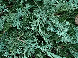 - 'Plumosa Albovariegata' nízký, široce opačně kuželovitý keř, výška 0.5 -1 m , široký 1-2m, pomalu roste, bílozelená barva mladých jehlic.