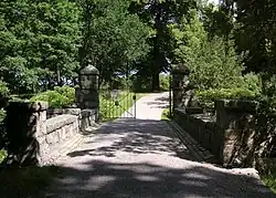 Můstek z parku na ostrov a velký křížový pomník u nejvyššího hrobu navrhl Ferdinand Boberg.