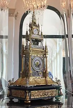 Císař si však hodiny objednával nejen v proslulých německých dílnách, ale zval si významné hodináře z říšských měst přímo do Prahy. K nejvýznamnějším z nich patřil Jost Bürgi (1552-1632), který si v Praze vybudoval hodinářskou dílnu. Jako první na světě zhotovil "vteřinové" hodiny nebo nejpřesnější "hvězdný" globus.[14] V letech 1604-1612 Bürgi v Praze spolupracoval s Johannem Keplerem a významně přispěl k přesnosti jeho astronomických výpočtů. Kepler ke svým studiím použil i Bürgiho astronomické hodiny ze sbírek Rudolfa II., jež byly součástí císařova souboru nazvaného Scientialia umístěného na velkém stole uprostřed "Kunstkammer".[10]
