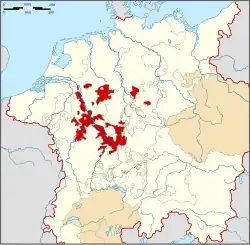 Říšské město Gelnhausen (trvalá říšská zástava, do r. 1736 z poloviny Hanavskému hrabství a Kurfalci, poté Hanavská část připadla i s vlastním Hanavskem Hesensku, od r. 1746 celé město v hesenské zástavě)