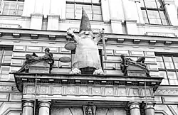 Trpaslík nad vchodem do VŠUP v Praze, září 1991