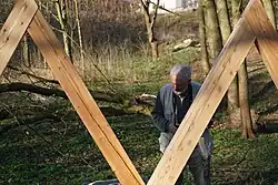 Kurt Gebauer dokončuje Památník zaniklé osady Amerika v Plzni, březen 2019.