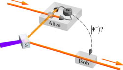 - ↑ Například když Alice i Bob vědí, že přenášený kvantový stav je roven buď anebo , pouze nevědí, která z těchto dvou možností zrovna nastala. Pak stačí, když Alice změří svoji částici v bázi a získaný výsledek, zakódovaný do jednoho bitu, zašle Bobovi. Bob následně čistě na základě přijaté klasické zprávy vytvoří tentýž stav nanovo.