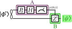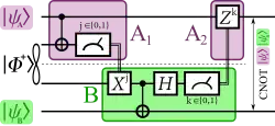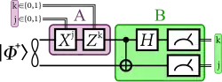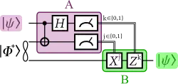 a tak například . Výsledné separabilní stavy dvou qubitů pak lze měřit pro každý qubit zvlášť ve výpočetní bázi. Naměřené výsledky jsou pak zaslány klasicky Bobovi, což je v obvodu vyjádřeno dvojitými čarami. Celkově tak dostáváme kvantový obvod vyobrazený vpravo.[pozn. 12] Formalizmus kvantových obvodů má svá specifika. Tak například nelze z diagramu vpravo poznat, kde se Bob vůči Alici nachází a jak jsou od sebe tito dva daleko. V běžné notaci také není zřetelné, které operace patří Alici a které Bobovi. Na obrázku jsou pro přehlednost dané operace seskupeny do barevných boxů, odchylujíce se přitom od používané konvence.