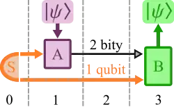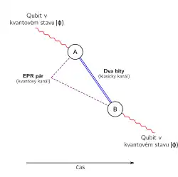 - ↑ Tento postřeh se vztahuje na přenos qubitů, kde částice přenášejí dvourozměrný stav. V případě vícerozměrných quditů je počet zpráv a tím i počet přenesených bitů větší.