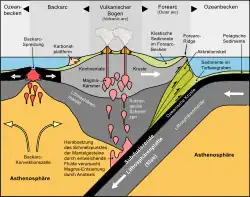 V zóně jižně od Kréty (hlubokomořský příkop) se africká deska podsouvá 5 cm ročně pod desku egejskou (součást eurasijské desky).[3] Ve hloubce cca 150 až 180 km jsou horniny zemského pláště nad podsunutou africkou deskou roztaveny a unikají z nich těkavé složky (oxid uhličitý, krystalické struktury, halogeny). Plyny, rozpuštěné v tavenině, tlačí roztavenou horninu vzhůru až na povrch Země ve formě sopek. Nachází se v zakřivené zóně přibližně 120 km severně od Kréty (sopečné produkty: andezit, dacit, ryolit).
