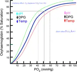 Hemoglobin má sigmoidovitou kinetiku. Při selektivním navazování na deoxyhemoglobin 2,3-BPG stabilizuje T stav, čímž znesnadňuje navazování kyslíku, který se tak lépe uvolňuje do tkání. 2,3-BPG takto brání hypoxii za podmínek, kdy je nejpravděpodobnější. Podmínky způsobující nízkou koncentraci kyslíku, jako je například vysoká nadmořská výška (množství 2,3-BPG je vyšší u lidí přizpůsobeným větším výškám), zúžení dýchacích cest nebo srdeční selhání vyvolávají tvorbu více 2,3-BPG, protože změny pH a koncentrace kyslíku působí na enzymy, které je vytvářejí a rozkládají.[2]. Toto uvolňování kyslíku podporuje Bohrův efekt, kdy afinitu hemoglobinu ke kyslíku snižuje také nižší pH a vysoké koncentrace oxidu uhličitého. Ve tkáních s vysokými nároky na energii se kyslík spotřebovává rychle, čímž se zvyšují koncentrace H+ a CO2. Bohrův efekt způsobuje, že hemoglobin vypouští více kyslíku, než kolik příslušné buňky potřebují. Oproti tomuto nemá 2,3-BPG žádný vliv na myoglobin.