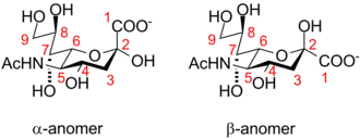 Pro odlišení derivátů kyseliny sialové je důležité číslování atomů uhlíku. Číslování začíná u karboxylového uhlíku a pokračuje podél řetězce. Podle konfigurace karboxylové skupiny se rozlišují dvě formy: alfa-anomer a beta-anomer. Alfa-anomer je forma charakteristická pro kyselinu sialovou vázánou na glykoproteiny. Beta-anomer převažuje (více než 90%) v roztoku kyseliny sialové.