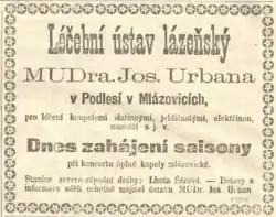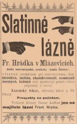 - ↑ Slatinné lázně Fr. Hrádka v Mlázovicích. Hlasy pojizerské [online]. 1901-07-21 [cit. 2024-08-21]. Dostupné online.