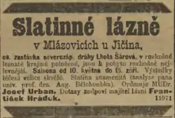 - ↑ Slatinné lázně v Mlázovicích. Jičínský obzor [online]. 1897-07-17 [cit. 2024-08-21]. Dostupné online.