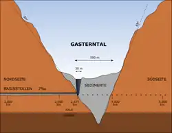 Další událost se odehrála 24. července 1908 při ražbě severní části tunelu. Při ražbě na 2,675 km došlo k průrazu do vrstvy sedimentů pod údolím Gasterntal. Ve 2:30 hod. po odstřelu byly vyrubané prostory tunelu zaplaveny 6.000-7.000 m³ bahna a kamení. Při tomto se na povrchu údolí Gasterntalu vytvořil trychtýř o průměru přibližně 30 m. Při nehodě zahynulo 26 pracovníků v mase řinoucího se bahna a kamení. Těla 24 obětí nebyla nikdy nalezena a zůstávají v opuštěné části tunelu. Následkem této události byla práce na severní straně tunelu přerušena a byla vytyčena nová osa tunelu, obcházející místo se sedimenty východním směrem od původního plánu. Katastrofu způsobil špatný odhad mocnosti a polohy sedimentační vrstvy, kdy se předpokládalo, že se nachází až o 100 m níže v údolí. Ze severní strany bylo místo katastrofy v tunelu na 1,436 km uzavřeno 10 m silnou zdí a ražba pokračovala jiným směrem.