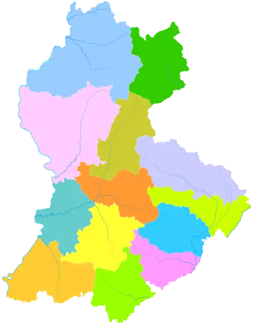 | Čung-jang | 中阳县 | 138 498 | 1 435 | 97 |