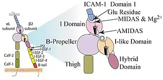 LFA-1 se vyznačuje nejméně třemi konformačními stavy, které jsou charakterizovány pozicí extracelulárních domén a cytoplasmatického řetězce. [4] V neaktivním stavu je molekula LFA-1 v ohnuté konformaci a má nízkou afinitu pro ICAM. Tato ohnutá konformace ukrývá MIDAS místo.[5] Navázání ligandu do MIDAS místa způsobí posun α7 helixu a změnu pozice hybridní domény. To dále vyústí v oddálení extracelulárních domén α-podjednotky a β-podjednotky. [4] Změna konformace LFA-1 vede k až 10 000 násobnému zvýšení afinity pro ligand. [6]